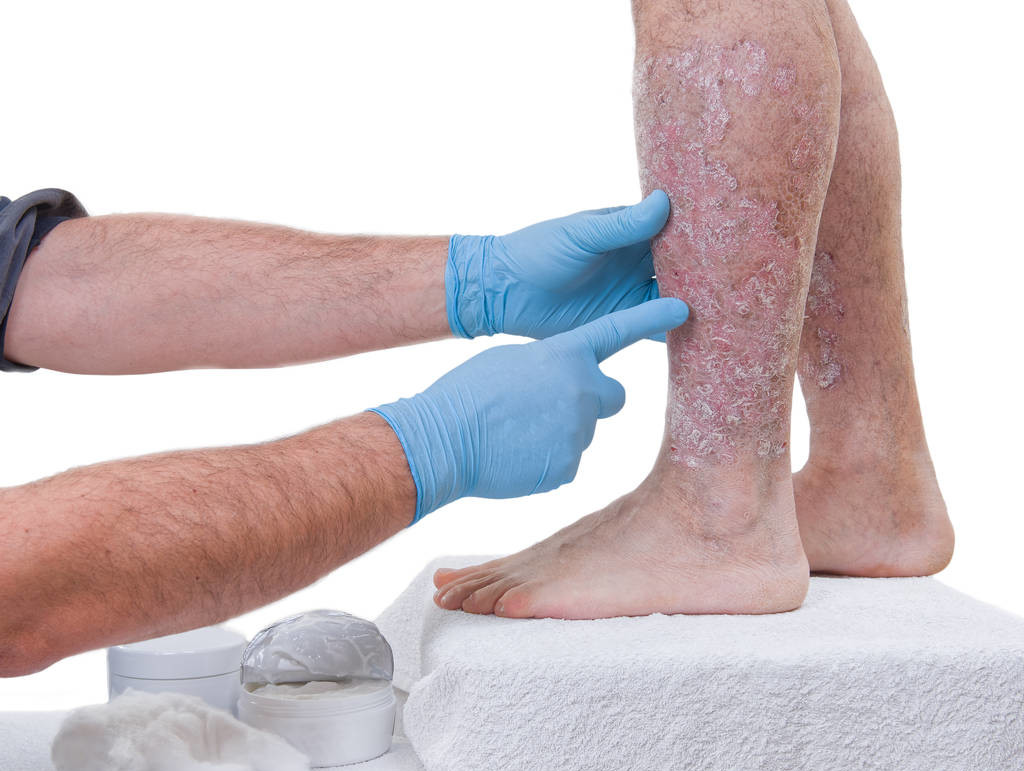 1. 斑塊狀牛皮癬 (Plaque Psoriasis)——患者的皮膚出現粉紅或紅色鱗狀且突出的斑塊,於膝及手肘特別明顯。